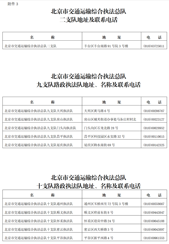3.北京市交通运输综合执法总队二、九、十支队地址、名称及联系电话