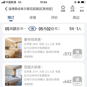 某点评平台显示,上述酒店5月1日的客房已经订满,其中最便宜的房间单价为572元,最贵的为1365元。