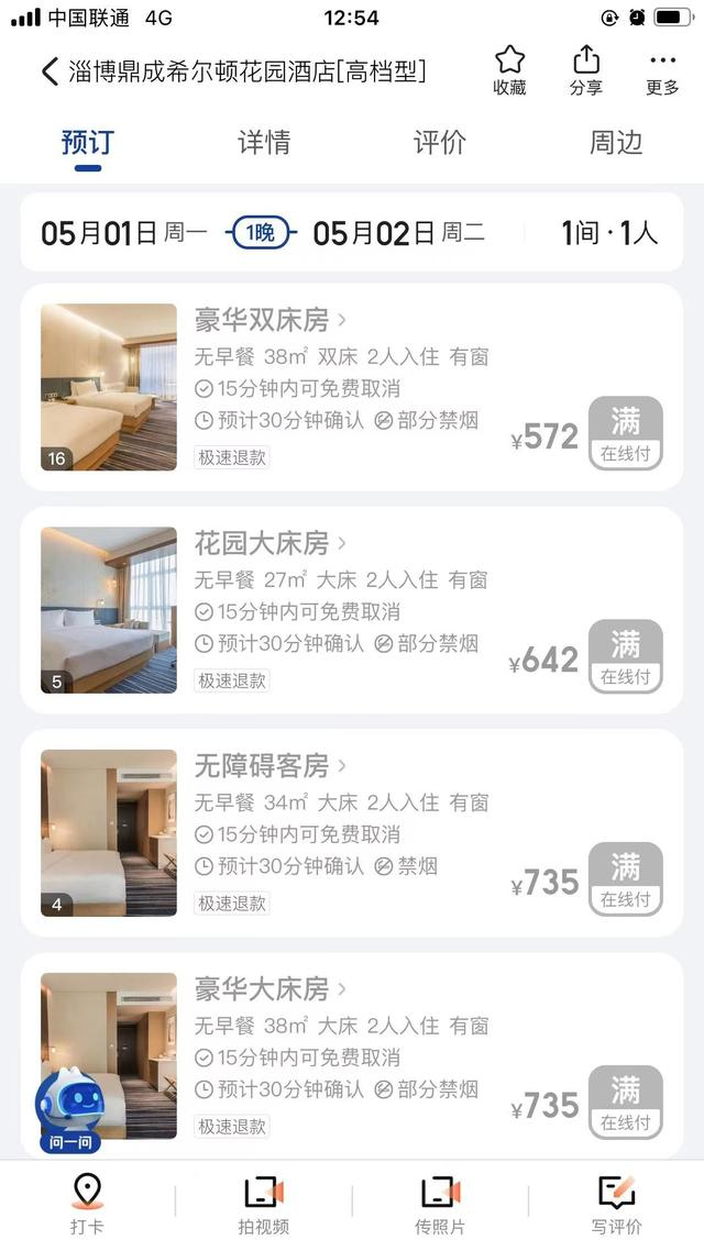 他早早通过旅游平台定了淄博的酒店,他告诉九派新闻,其预定的是淄博鼎成希尔顿花园酒店,预定价格为1341元。