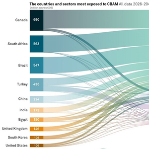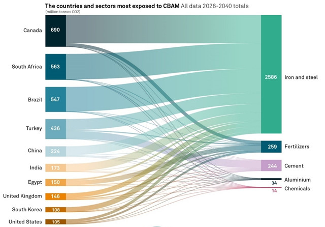 标普全球(S&P Global)此前发布的预测显示,根据2026~2040年CBAM涉及产品的预计碳排放量,最容易受到该机制影响的十个国家分别是加拿大、南非、巴西、土耳其、中国、印度、埃及、英国、韩国和美国。其中,前四位对欧盟出口产品涉及的碳排放显著高于其他国家,加拿大最高,达到6.9亿吨。