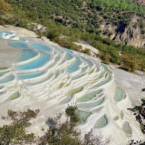 白水台是由于碳酸钙溶解于泉水中而形成的自然奇观。含碳酸氢钙的泉水慢慢下流,碳酸盐逐渐沉淀,长年累月就形成台幔,好似层层梯田,被称为“仙人遗田”,纳西语为“巴卜芝”,意为逐渐长大的莲花,面积约3平方公里,它是我国最大的华泉台地。