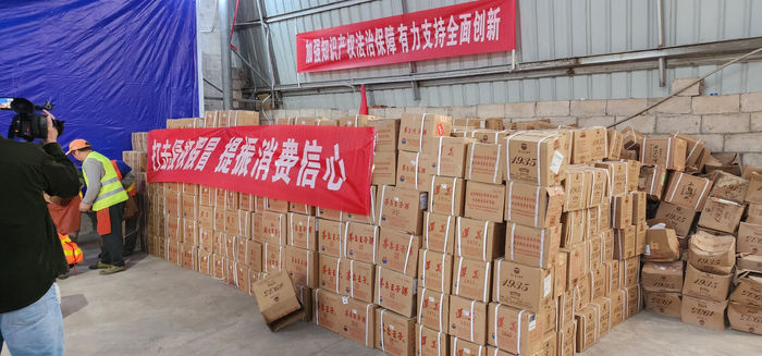 销毁活动现场,近千箱各种侵权假冒品牌白酒,整齐地摆放着,随着“销毁”一声令下,十几个工作人员立即上前,将一箱箱假酒搬下来,拆除包装,取出酒瓶……工作人员拿起锤子,用力一敲,随着瓶子不断破碎,这批数量巨大的假酒被集中销毁,彰显了执法机关严打假冒伪劣产品的决心和信心,保护商标持有人的合法权益,维护消费者舌尖上的安全。