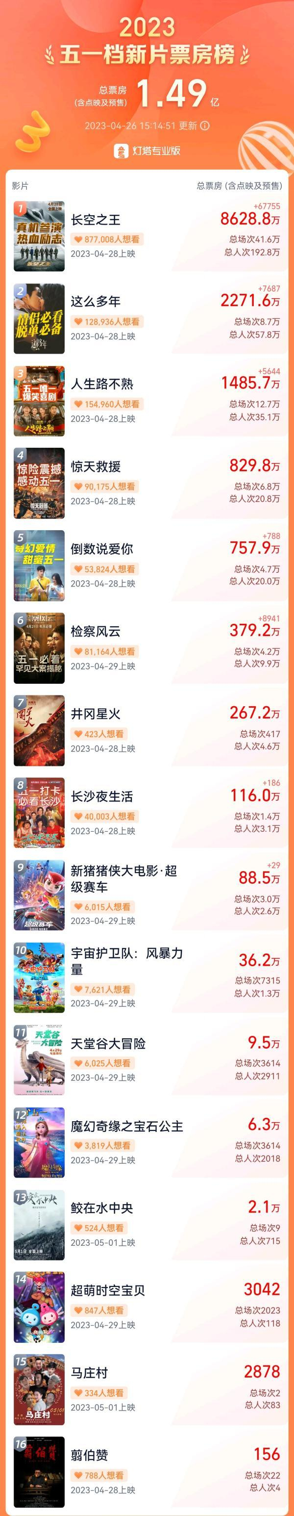 据灯塔专业版数据显示,截至4月26日中午,距离放假还有2天半,2023年五一档5天假期内(4月29日-5月3日)的大盘预售票房突破6000万元,整体预售表现明显好于2021年五一档同期。“2021年五一档也是5天假期,并以16.74亿元刷新五一档票房纪录,今年五一档如果延续预售的良好势头,有希望再次刷新纪录,延续今年春节档的良好表现,为全年市场复苏打下良好基础。”陈晋说。