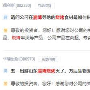 目前,已经有多家上市公司遭遇了投资者有无“淄博”“烧烤”等相关产业的“烤问”。不少投资者也是绞尽脑汁的想要把一些公司与淄博烧烤相绑定。