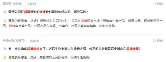 不光是投资者,企业也在努力获取“淄博烧烤”的红利,不少企业在回复投资者提问时主动提及淄博和烧烤。
