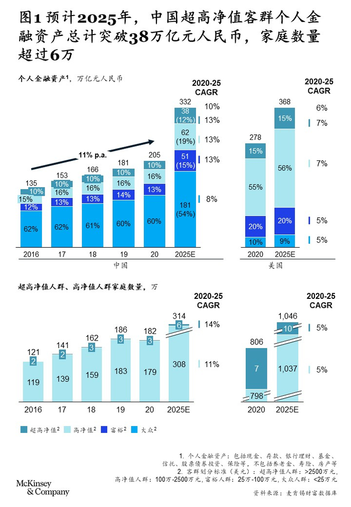 根据麦肯锡的分析,预计未来五年,中国超高净值人群总资产将以13%的速度高速增长,管理资产规模将从2020年的21万亿元人民币,增至2025年的38万亿元人民币。超高净值家庭数量,也将在未来五年内从2020年的3.1万提升到2025年的6万。