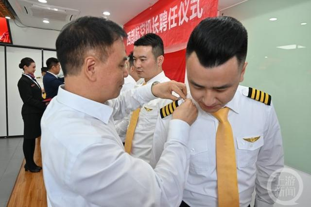 在现场,飞行部为10名新聘机长颁发聘书,为他们佩戴肩章。随后,新机长进行了庄严的机长宣誓仪式。