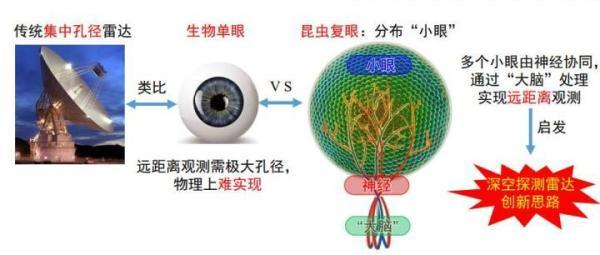 据龙腾介绍,“中国复眼”由多个小天线构成的一个大雷达,就像昆虫的复眼,它能自己发射电磁波探测小行星,并接收自己所发电磁波的回波;而大众熟悉的“中国天眼”是个500米口径的射电天文望远镜,不发射电磁波,而是接收星体发射出来的信号。