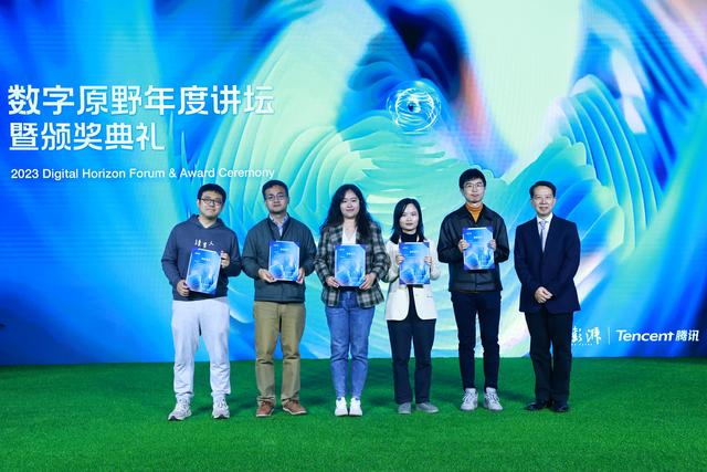 从左到右:数字原野奖提名奖获奖代表董晨宇、苗伟山、许馨月、章玉萍、沈锦浩、数字原野奖评委会主席邱泽奇教授
