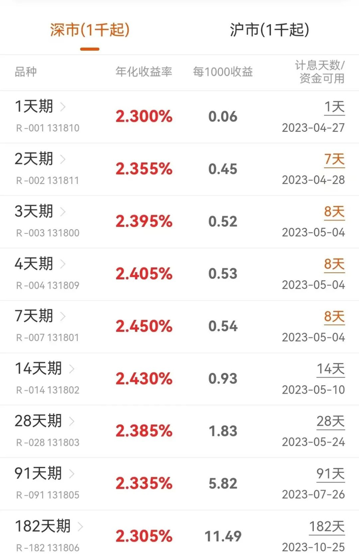单从计息时间来看,目前五一国债逆回购最佳操作日期是本周四(4月27日)。当日,投资者可以借出1天期逆回购(沪市逆回购简称GC001,代码204001;深市逆回购简称R-001,代码131810),就可以收获6天利息,资金在5月4日盘前已可用,虽不能提现,但可进行股票交易。