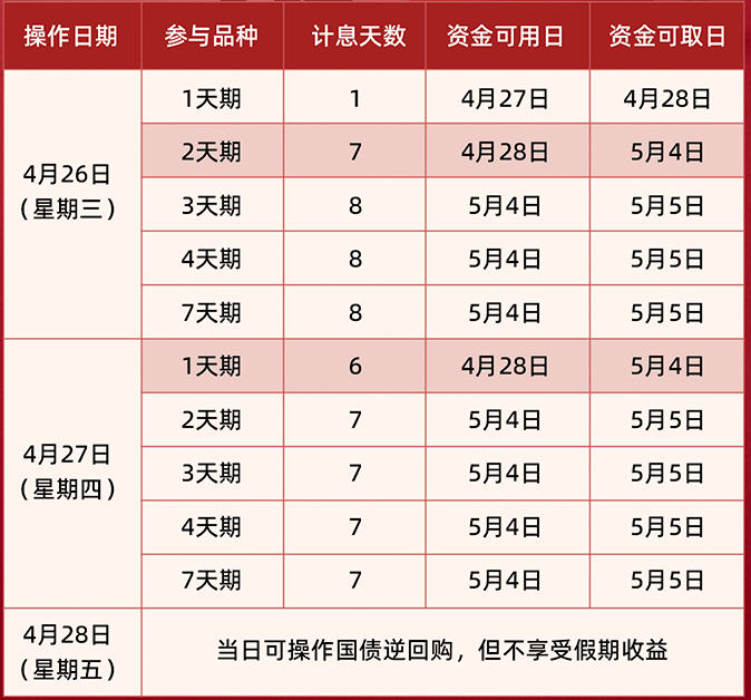 五一假期,根据交易所安排,4月29日(星期六)至5月3日(星期三)休市,5月4日(星期四)起股市照常开市。结合上述安排,本周四(4月27日)就是操作国债逆回购的最佳时点之一。4月27日当天,只需投资1天期逆回购就可以赚到6天的利息,而且资金在5月4日开盘前即可到账,也可用于继续投资。