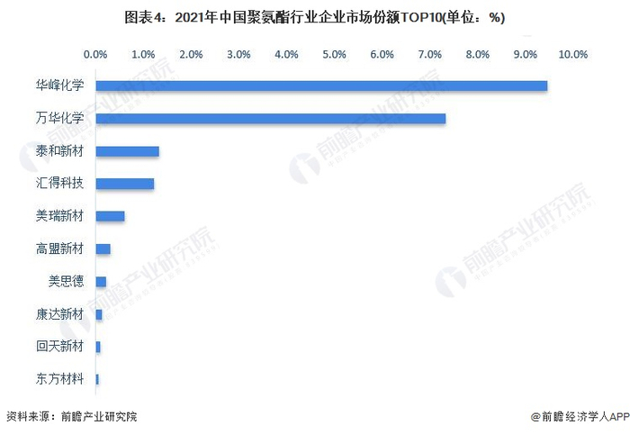 依据2021年有关聚氨酯业务市占率情况,我国聚氨酯行业市占率最高的上市企业为华峰化学(002064.SZ),达到10.1%;其次为万华化学(600309.SH),市占率为7.8%。