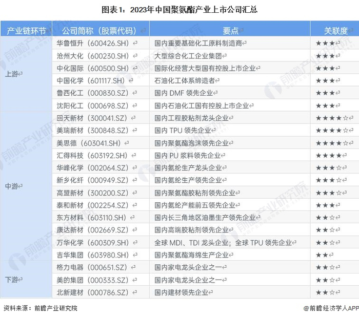 聚氨酯产业原材料、中游产品生产以及下游应用领域的上市企业数量众多,中游包括华峰化学(002064.SZ)、万华化学(600309.SH)、高盟新材(300200.SZ)等。具体上市公司信息如下: