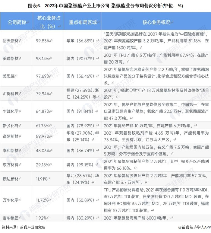 从业务布局来看,核心业务占比方面,回天新材(300041.SZ)、美瑞新材(300848.SZ)、美思德(603041.SH)均在90%以上,表明上述企业的业务较为集中;重点布局区域方面,各大上市企业多以境内业务为主,万华化学(600309.SH)、美思德(603041.SH)全球化经营,国内外区域业务占比大致呈五五分;核心业务概况方面,华峰化学(002064.SZ)氨纶产能22.5万吨,聚氨酯原液产能47.0万吨。