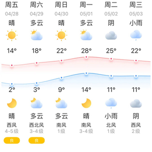 2023年“五一”劳动节共放假5天!放假时间为4月29日至5月3日!根据气象预报,预计假期我市以晴天或多云天气为主,气温在3°C至28°C之间,天气较好,温度适宜,适宜出行。