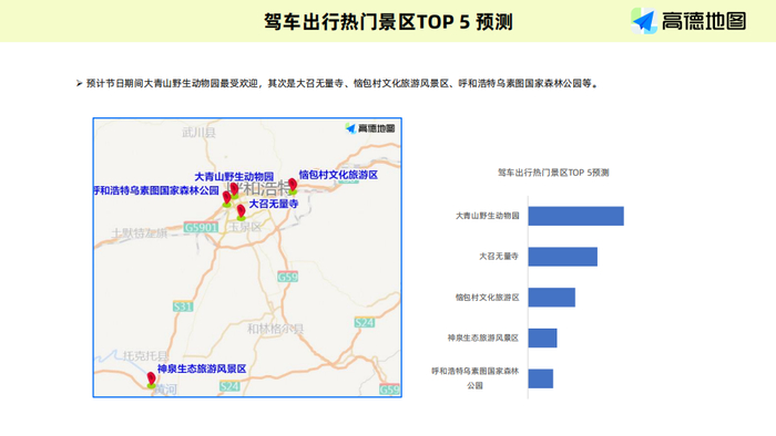 节日期间,每日10时至16时商圈周边交通流量显著增长。鄂尔多斯大街凯得MALL、七彩城购物中心,中山路维多利商圈,新华大街摩尔城商圈、东万达商圈等周边道路车辆将明显增加,人流也将集中出现,周边停车场将出现阶段性饱和,建议市民尽量绿色出行。同时,城区周边游人流车流激增,大青山野生动物园最受欢迎,其次是大召无量寺、恼包村文化旅游区、乌素图国家森林公园等景区道路可能出现短拥堵。