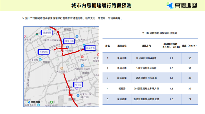 市区相对拥堵时段约在每日9:30-12:30与14:30-19:30,预计城区南二环快速路、新华大街、通道北路、昭君路、锡林路、车站西街等主干道会在每天上午10:30左右、下午16:00左右出现高峰;二环路平均时速从70km/h下降到60km/h;主干道平均时速从40Km/h下降到30Km/h。