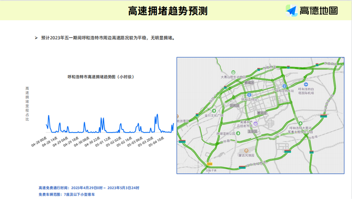 数据显示,近年来“五一”小长假全国高速拥堵里程占比呈现逐年上升态势,预计2023年“五一”假期高速拥堵程度将成为历年最高,同比去年涨幅预计超10%。2023年“五一”假期,呼和浩特市各主要出城道路以及通往各主要购物商圈、风景区、城市核心区道路的人车流量会有明显增加,交通压力将进一步增大,但总体情况较为平稳,无明显拥堵。