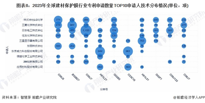 目前,全球建材保护膜行业专利申请数量TOP10申请人技术主要布局在C08J5细分领域,其中全球建材保护膜专利申请量第一的株式会社LG化学在该细分领域专利申请量达到771项。