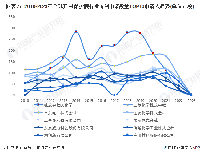 全球建材保护膜行业专利申请数量TOP10申请人分别是株式会社LG化学、三菱化学株式会社、日东电工株式会社、东京威力科创股份有限公司、信越化学工业株式会社、应用材料股份有限公司等。