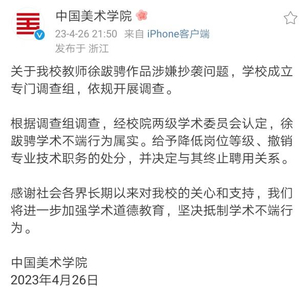 4月26日晚间21:50分,中国美院发布消息:关于我校教师徐x骋作品涉嫌抄袭问题,学校成立专门调查组,依规开展调查。根据调查组调查,经校院两级学术委员会认定,徐x骋学术不端行为属实。给予降低岗位等级、撤销专业技术职务的处分,并决定与其终止聘用关系。感谢社会各界长期以来对我校的关心和支持,我们将进一步加强学术道德教育,坚决抵制学术不端行为。