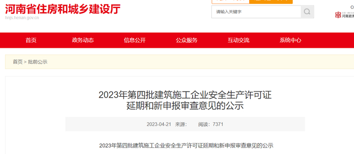河南省2023年第四批建筑施工企业安全生产许可证延期和新申报审查意见的公示