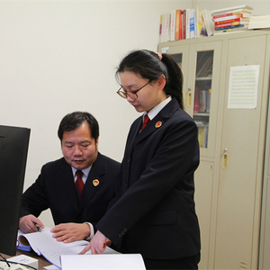 江汉区检察院第四检察部检察官金升展与检察官助理王冰寒研讨案情。