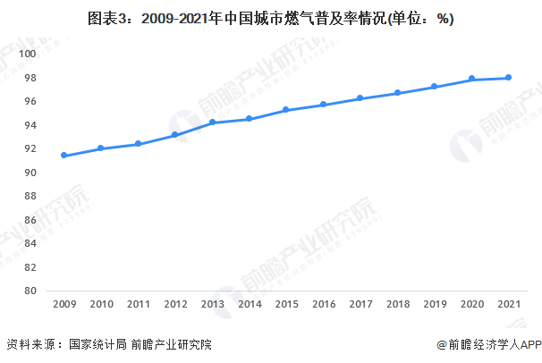 近年来,随着城市改造规划推进、老城区供气管网改造,城市燃气普及率进一步提高。2009-2021年,中国城市燃气普及率逐年提高,由91.41%提升至98.00%,中国城市燃气普及率位于较高水平。