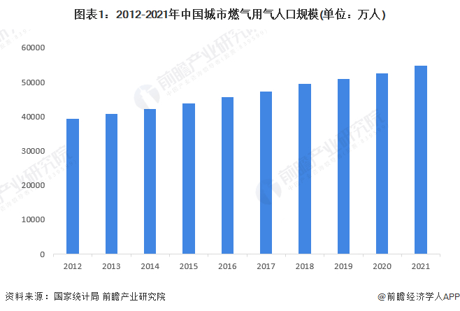 中国城市化进程、家庭小型化趋势是城市燃气行业持续成长的动力。随着中国城市化进程不断加快,促使城市人口的快速增加,扩大了用气人口的基数。2012-2021年,我国城市燃气用气人口持续增长,2021年达到5.5亿人,其中使用天然气的人口最多,约有4.4亿人。