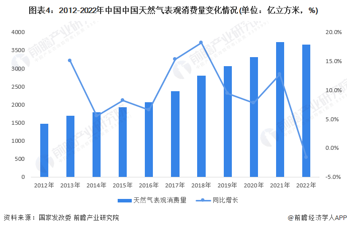 近年来,我国天然气的消费量快速增长。2019年,中国宏观经济平稳运行,天然气行业增速减缓,天然气表观消费量3067亿立方米,同比增长9.4%,增速环比2018年下降8.7个百分点。中国天然气市场发展近二十年来,2022年度受国内经济增长放缓和国际天然气价格高企影响,天然气消费量首次出现下降。国家发改委统计数据显示,2022年全国天然气表观消费量3663亿立方米,同比下降1.7%。