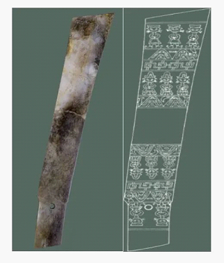 大约与商代同时,远在西南的蜀地也有隆重的祭山活动。广汉三星堆二号器物坑出土了一件非常特别的玉璋,玉璋上有山形图案和祭司形象,其中有的祭司下跪,两山之间还有疑似祭坛的器物,这显然是古蜀人祭山的场景,人们就叫它《祭山图》。