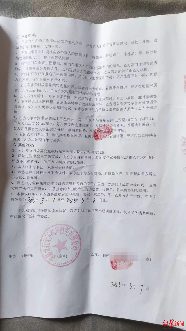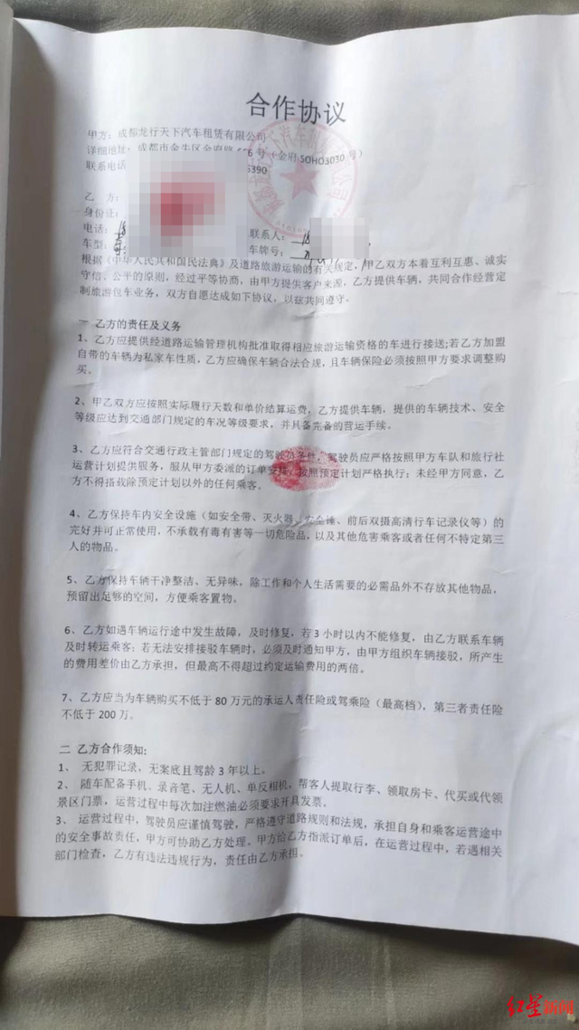记者看到,在刘礼与龙行公司的《合作协议》中写道:由甲方提供客户来源,乙方(刘礼)提供资料,共同合作经营定制旅游包车业务……若乙方加盟自带的车辆为私家车性质,应确保车辆合法合规……在运营过程中,若遇相关部门检查,乙方有违法违规行为,责任由乙方承担。