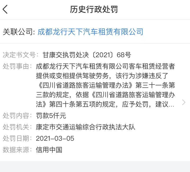 记者查询到,龙行公司早在2021年就因违规提供驾驶劳务而受到康定市交通运输综合行政执法大队的处罚,罚款5000元,处罚事由为提供或变相提供驾驶劳务。