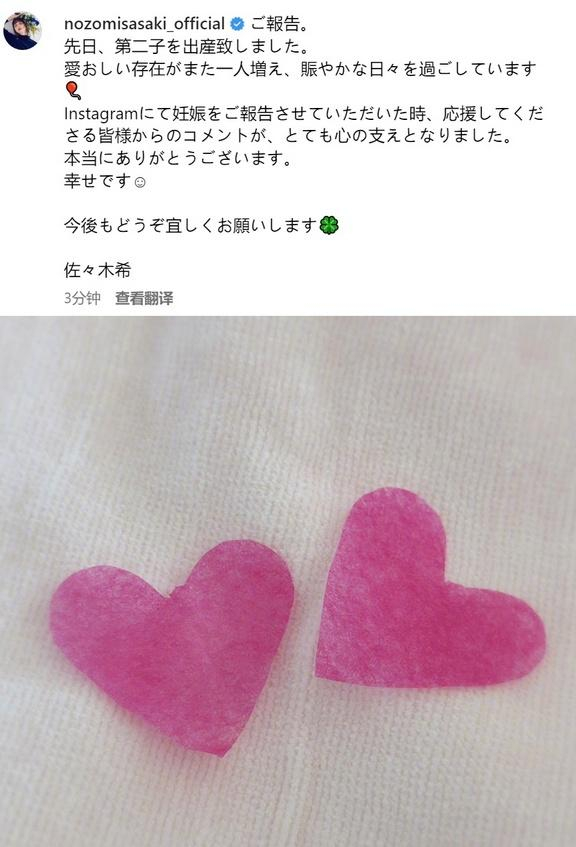 4月27日,日本女星佐佐木希在社交账号发文宣布产下二胎。