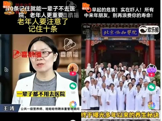 四、健康养生、生活妙招等内容用户喜闻乐见,但其中充斥着大量伪科学。最典型的标题就是:“吃xx食物会致癌/防癌/抗癌”“做xx动作可以预防疾病/治疗疾病/导致生病/不导致生病”“为了家人的健康,一定要/不要这么做”等。实际上,疾病是多种因素共同作用的结果,谣言视频中把疾病归因于单一因素,是把复杂的问题简单化。网传诸多预防疾病、抗癌防癌的民间偏方,很多都没有科学依据。这类视频制作者正是抓住了老年人对疾病的恐惧心理,制作出大量伪科学视频,大肆传播。