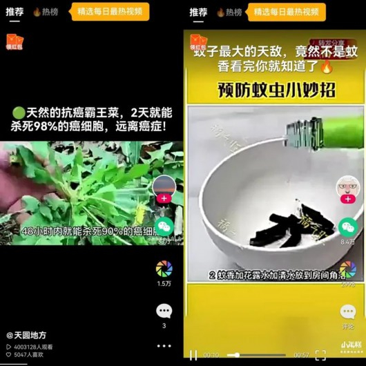 记者观看发现,这类小视频小程序不仅传播谣言和伪科学,还充斥着大量封建迷信和毒鸡汤,内容主要集中在老年人关心的健康养生、食品安全、国际局势、历史知识等领域。若老年人相信视频内容,可能带来财产损失和人身伤害。比如,不少视频所称的“民间偏方”并不能防病治病,还有些所谓的“生活诀窍”风险不小,比如鼓动观看者用化学材料自制电蚊香液等。