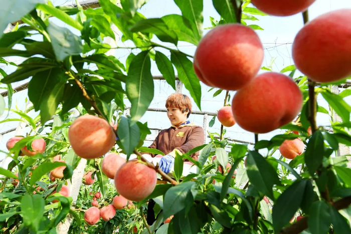 杨家埝民俗村的春桃熟了,一个个鲜红的模样在碧叶的映衬下,像面目含羞的姑娘,香气浓郁……