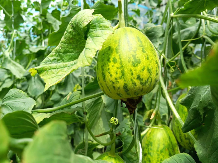 乐亭万事达生态农业发展有限公司的甜瓜生长姿势与常规的地爬式不同,一个个饱满圆润吊着长在半空中,十分诱人。大棚里的瓜农虽说年龄不大,但却是一个种瓜的老把式,她能根据甜瓜的颜色和大小,准确判断甜瓜在各个生长阶段的口感。
