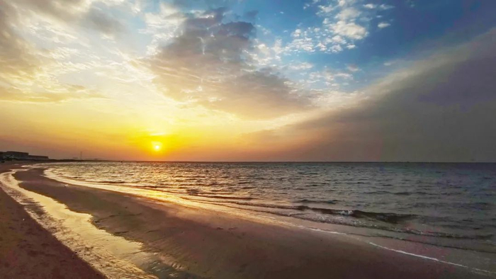 傍晚时分,落日的余晖透过云层洒落在海面,大海犹如披上了一层薄薄的金纱,美丽动人。海滩上,恋人牵手漫步,孩童追逐游戏,渔民织网修船,时光静谧且美好。