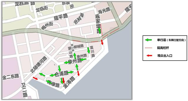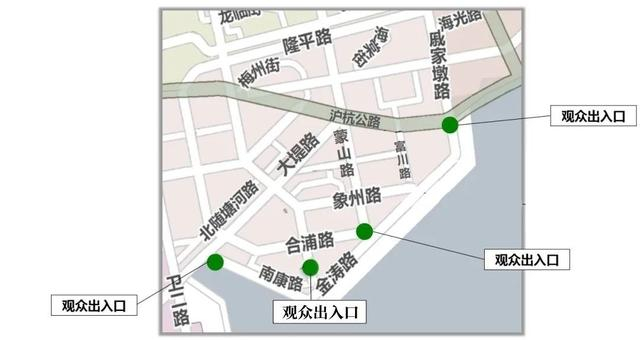 此次烟花秀共设置4个观众出入口,分别为戚家墩路出入口(游客集散中心)、蒙山路出入口、新城路出入口、大堤路出入口。