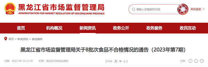 黑龙江省市场监管局关于8批次食品不合格情况的通告(2023年第7期)