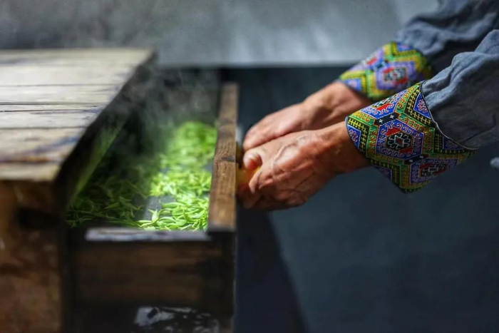 鲜叶摊放、蒸汽杀青、扇干水汽、炒头毛火、揉捻、铲二毛火、整形上光、焙火提香、拣选,九道工序一个也不能少。“恩施玉露”茶便是采用柴火烘焙,沿袭唐朝制茶的蒸青工艺,严格按照“恩施玉露”九道加工工序,并采用“搂、端、搓、扎”四道手法,由非遗传承人按传统手工工艺精心搓制,成品茶再经过筛分和手工拣选出整齐划一的茶条。