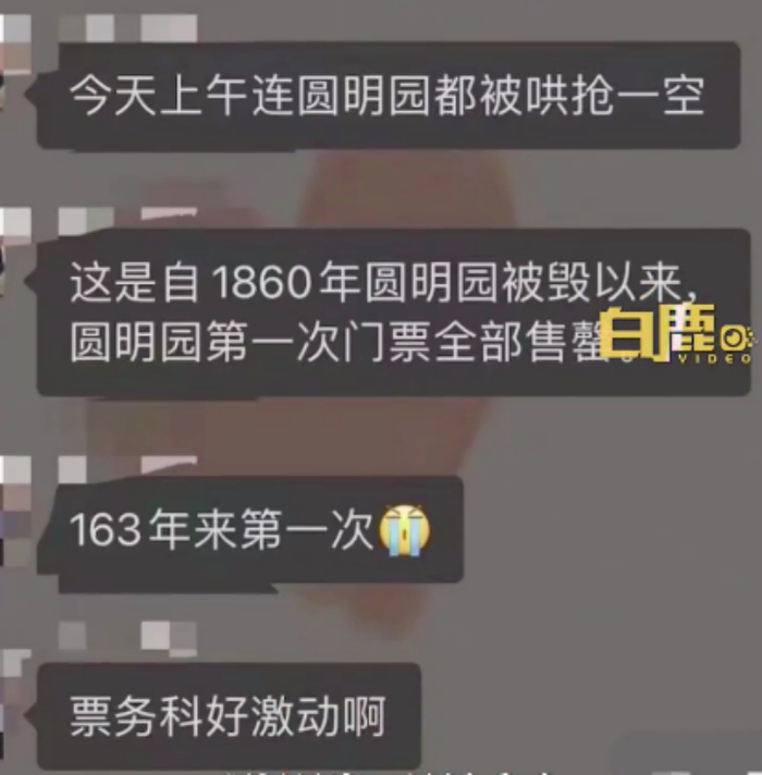 网友表示,今天上午圆明园的门票被哄抢一空,这是163年来第一次门票全部售罄。