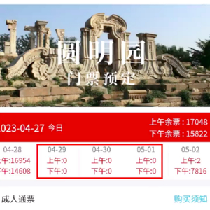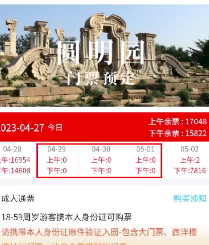 圆明园遗址公园线上门票预订页面显示,4月29日至5月1日,成人票和未成年票余票均显示为零。