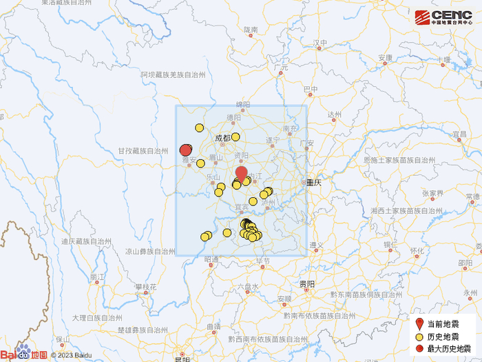历史地震:根据中国地震台网速报目录,震中周边200公里内近5年来发生3级以上地震共290次,最大地震是2022年6月1日在四川雅安市芦山县发生的6.1级地震(距离本次震中184公里),按震级大小前50次历史地震分布如图。