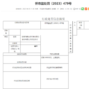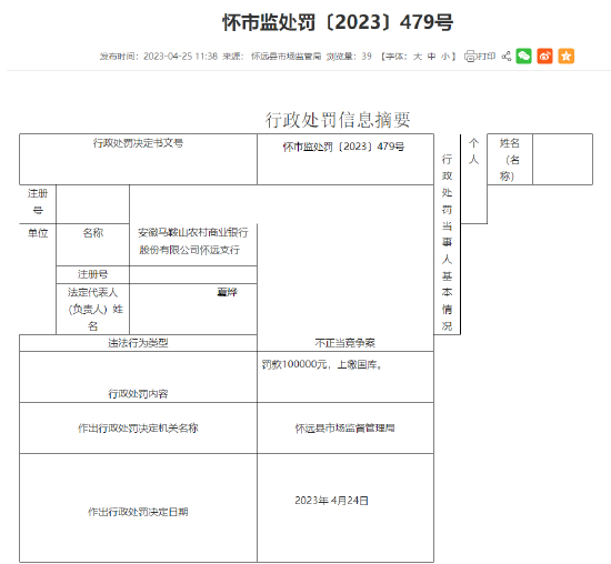 最终,怀远县市场监管局给予马鞍山农村商业银行怀远支行下列行政处罚:罚款100000元,上缴国库。