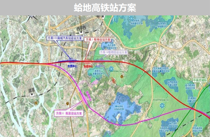 公告附上了总部基地片区交通与空间环境综合改善方案,其中涉及了南城蛤地高铁站的选址方案。
