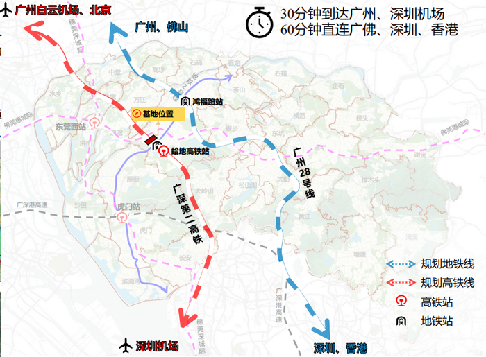 利用广州28号线,实现与深圳、广州中心区、香港、佛山的直通直连,借助轨道2号线鸿福路站实现无缝换乘。