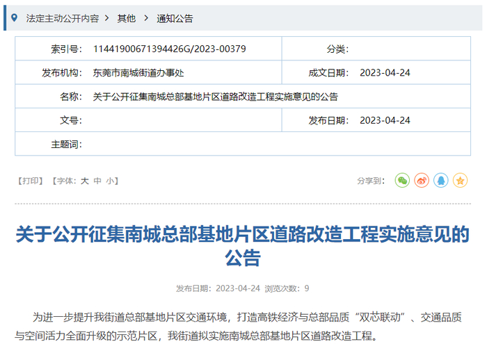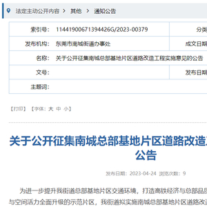 4月24日,东莞南城发布最新公告,拟对南城总部基地片区交通环境进行改造,打造高铁经济与总部品质“双芯联动”、交通品质与空间活力全面升级的示范片区。