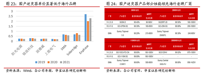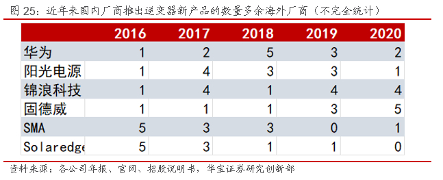 2)技术更新迭代速度更快,每一次产品的迭代平均可以带来成本6%的下降。由于国内光伏产业链条完整,技术工艺全球领先,国内厂商与上下游的联系更紧密,更能及时捕捉到用户痛点,在新产品开发方面具有优势。近年来国内厂商加速产品迭代,丰富产品线,对输入电流、产品容量等性能指标进行升级,以更好地满足各类客户对于不同使用场景的需求,推出新产品的速度快于海外厂商。